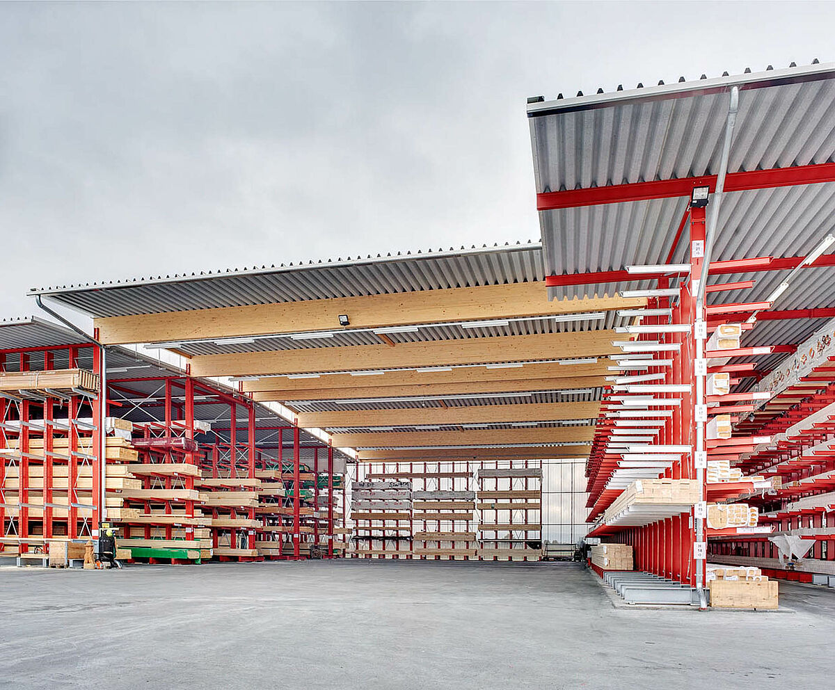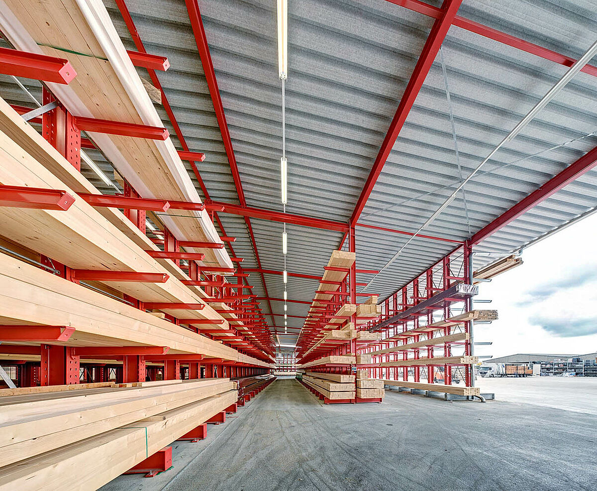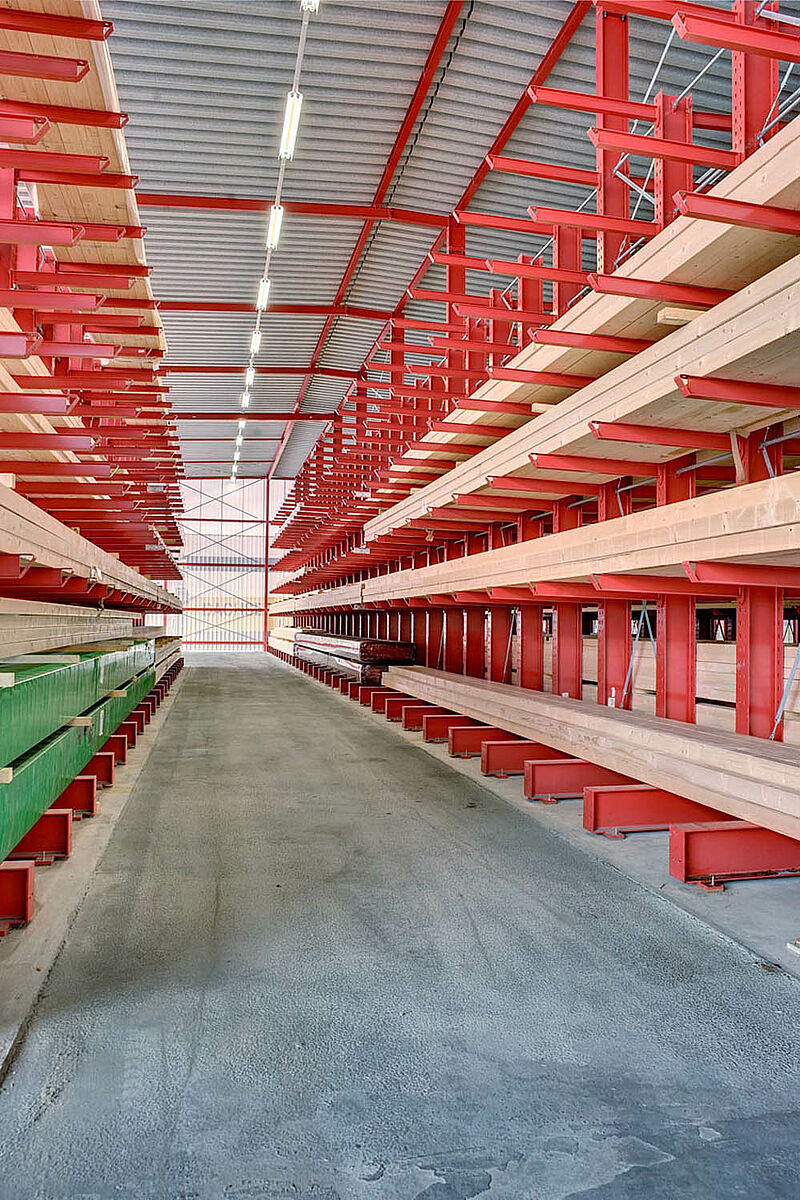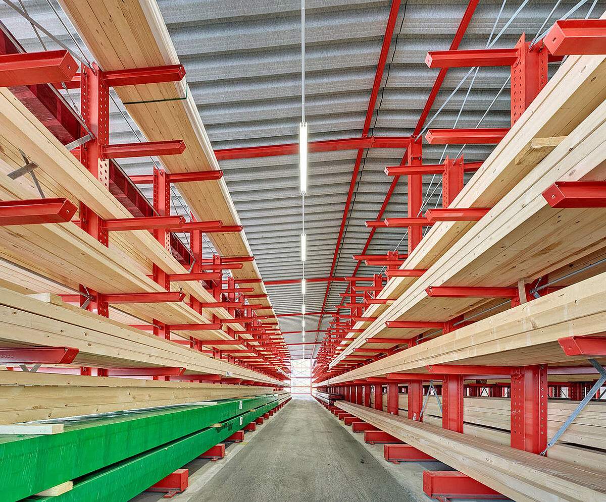 I doppi scaffali con bracci a sbalzo nel loro punto più alto toccano gli 8.600 mm e offrono sei livelli di stoccaggio per ogni lato dello scaffale. Con una portata di 800 kg per braccio, in questo modo in un piano degli scaffali con 33 stand è possibile ad esempio predisporre un peso complessivo di 26,4 ton di materiale su un unico livello. La superficie del nuovo magazzino per il legname è di circa 3.100 mq. L'altezza massima è di 9.750 mm. A riguardo occorre osservare che per la realizzazione del tetto sono state utilizzate, per scelta del cliente, lastre di acciaio e tavole di legno. La larghezza è di circa 21.000 mm. Grazie a questa prestazione realizzata in proprio il cliente è stato in grado di contenere i costi nella fase di realizzazione.