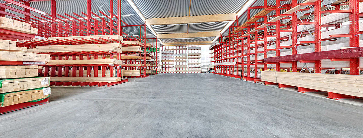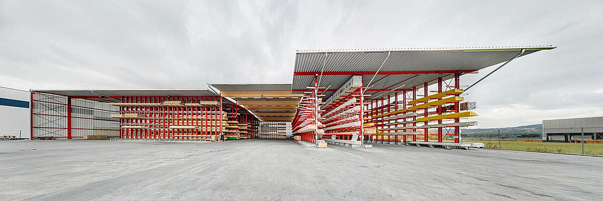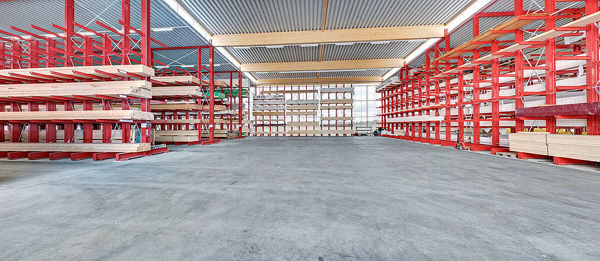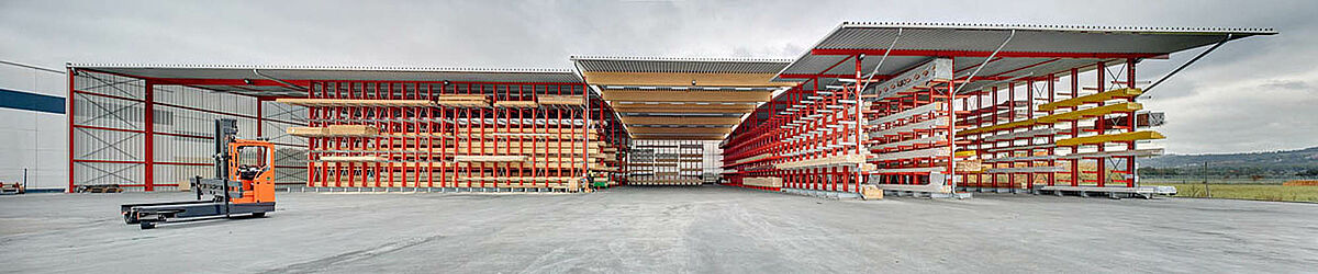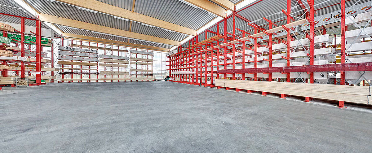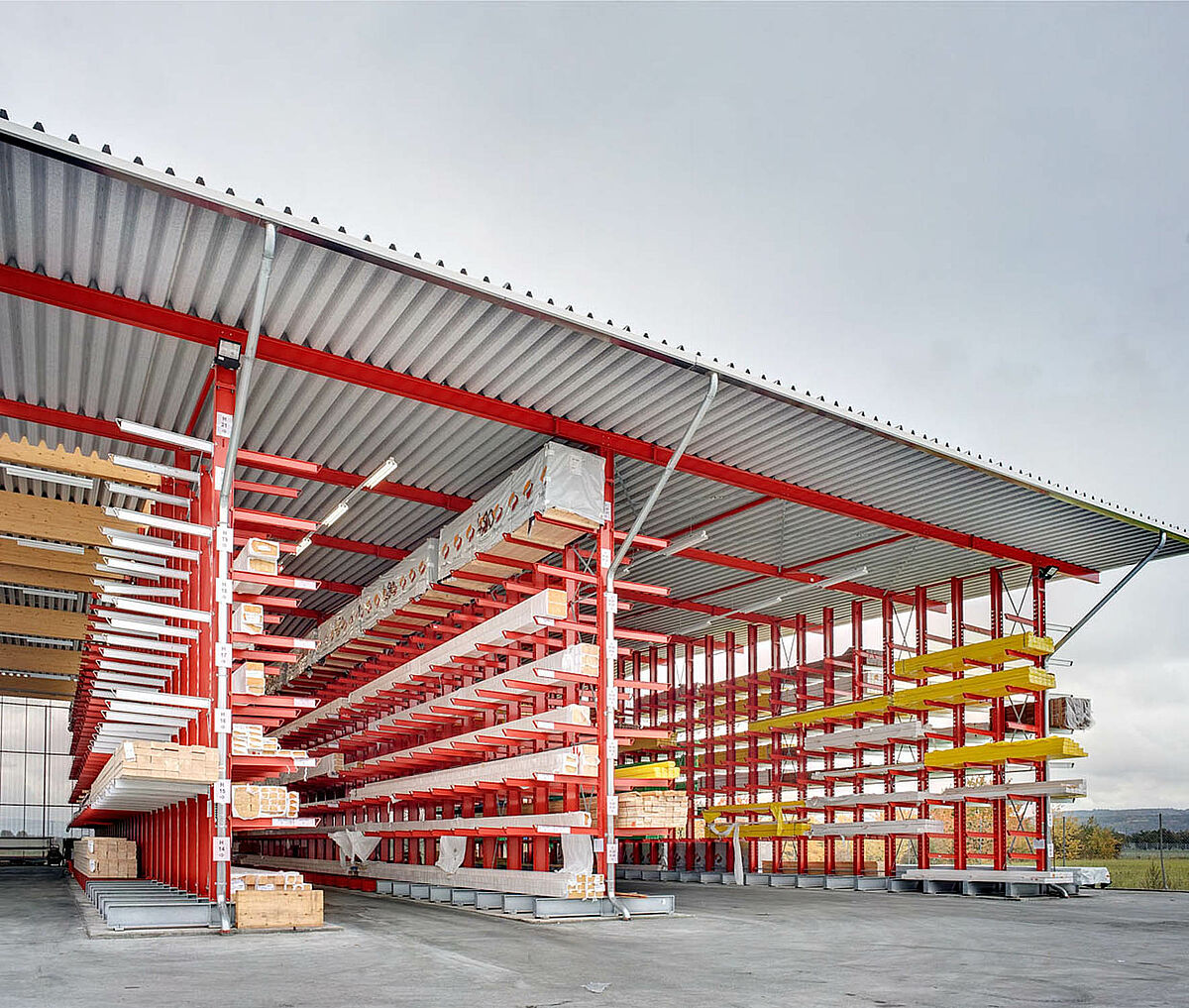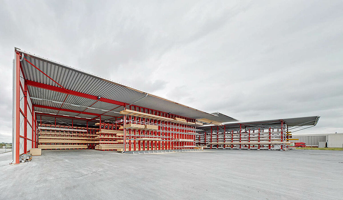 I doppi scaffali con bracci a sbalzo nel loro punto più alto toccano gli 8.600 mm e offrono sei livelli di stoccaggio per ogni lato dello scaffale. Con una portata di 800 kg per braccio, in questo modo in un piano degli scaffali con 33 stand è possibile ad esempio predisporre un peso complessivo di 26,4 ton di materiale su un unico livello. La superficie del nuovo magazzino per il legname è di circa 3.100 mq. L'altezza massima è di 9.750 mm. A riguardo occorre osservare che per la realizzazione del tetto sono state utilizzate, per scelta del cliente, lastre di acciaio e tavole di legno. La larghezza è di circa 21.000 mm. Grazie a questa prestazione realizzata in proprio il cliente è stato in grado di contenere i costi nella fase di realizzazione.