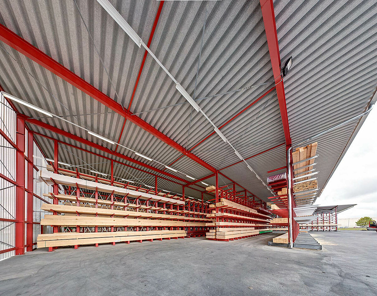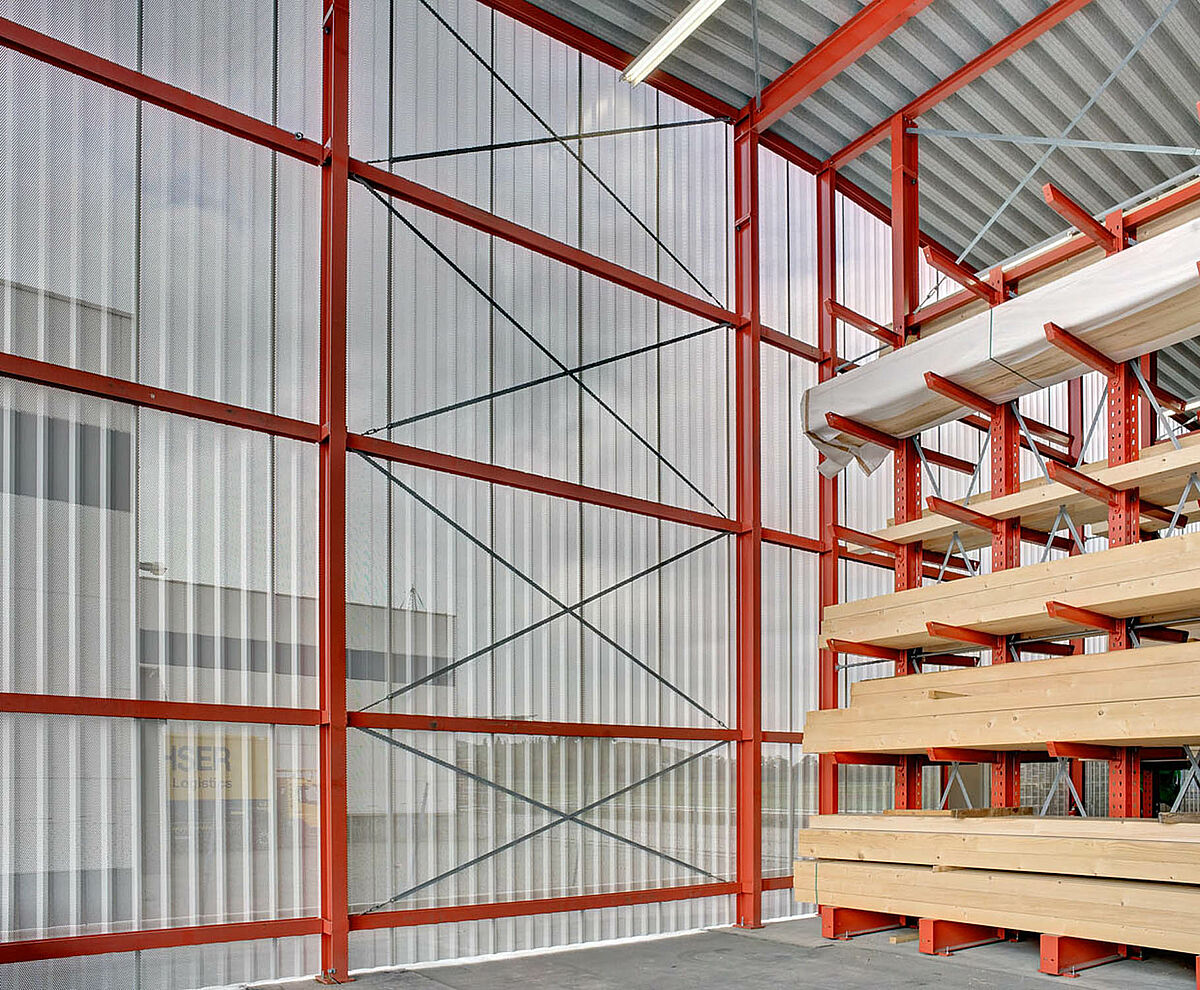 Già nella fase di pianificazione era evidente che la soluzione più conveniente per questo tipo di struttura era una scaffalatura aperta con scaffali con bracci a sbalzo come sottostruttura. Per il sistema di scaffalatura e la realizzazione di tetto e pareti, prodotti, forniti e montati da OHRA, sono stati utilizzate complessivamente 205 ton di acciaio.