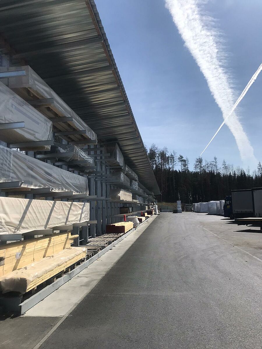 Nell’area esterna, le scaffalature cantilever con una lunghezza totale di quasi 250 metri con cinque livelli di stoccaggio offrono spazio per materiali da costruzione in legno fino a 13 metri di lunghezza,