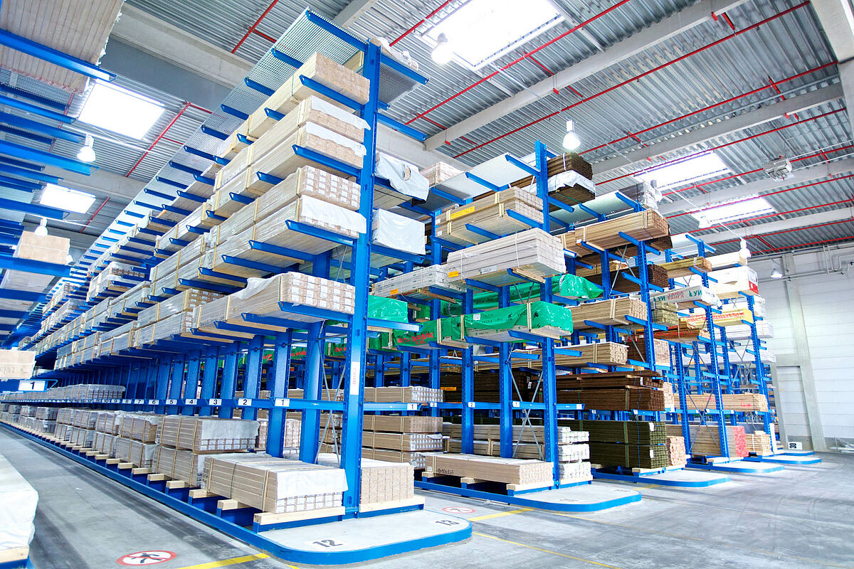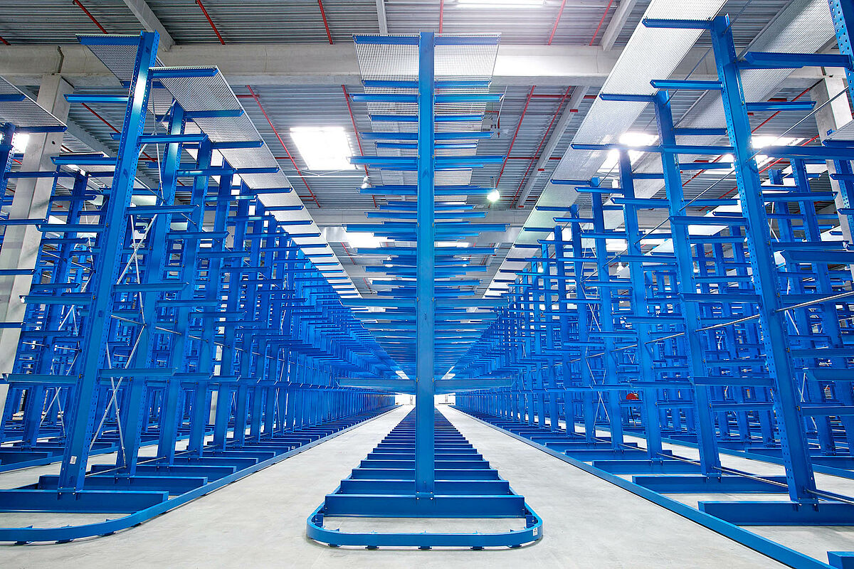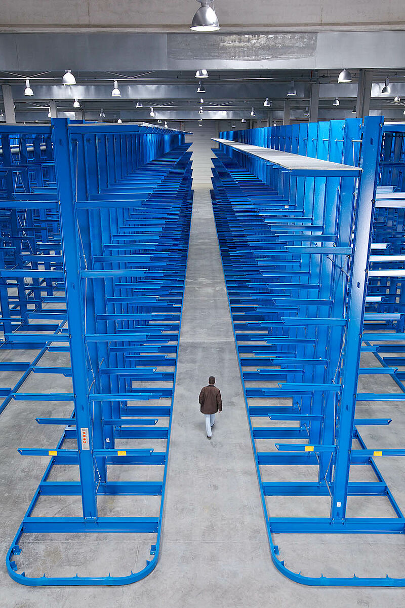 Così lo studio del progetto, in base alle valutazioni del reparto tecnico di DORAS, prevedeva da un lato l’installazione di scaffalature cantilever a 15 file di 75 m di lunghezza ed 8 m di altezza ciascuna per l’immagazzinamento di oggetti lunghi fino a 13 m, e dall’altro ulteriori 10 file di scaffalature per pallet alte 8,5 m e lunghe sempre 75 m. Complessivamente erano previste 22 corsie, di cui 12 con scaffalature cantilever per corsie strette. Per l’immagazzinamento ed il prelievo della merce si era optato per carrelli elevatori multidirezionali.