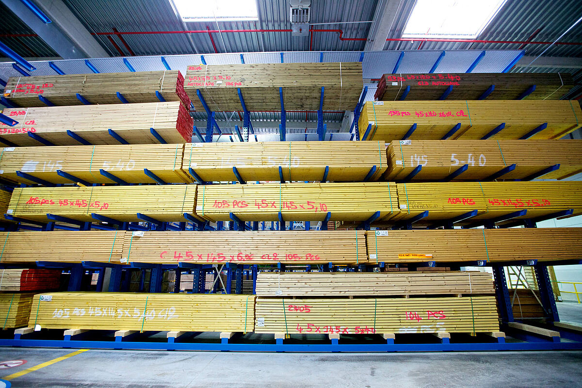 Ma anche nel dettaglio la soluzione a scaffalature di OHRA si è rivelata convincente: infatti l’azienda di Kerpen utilizza per le scaffalature cantilever esclusivamente acciai da costruzione unificati a parete piena, laminati a caldo – un materiale che, a differenza della lamiera, anche nella brusca gestione del magazzino, mantiene costanti le proprie caratteristiche statiche. La movimentazione della merce in fase di immagazzinamento o prelievo comporta il rischio di danneggiamento dei prodotti in caso di urto del mezzo contro i bracci orizzontali, specialmente in caso di travi di legno molto lunghe. A protezione della merce da immagazzinare e delle scaffalature, OHRA utilizza pertanto bracci agganciati autoprotettivi che, in caso di urto, si spostano verso l’alto o lateralmente evitando così danni a merce e scaffali.