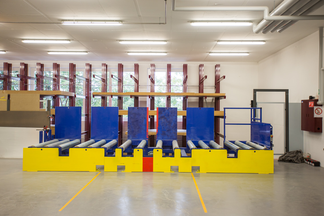 Le soluzioni tecniche delle scaffalature e del magazzino sono state fornite da OHRA: la casa produttrice tedesca di Kerpen è specializzata nella costruzione e  progettazione di scaffali per lo stoccaggio di legname ed è leader europeo nella  produzione di scaffalature cantilever. Il magazzino automatico a una corsia, lungo 40 metri, è in grado di alloggiare diversi pannelli utilizzati per rifiniture interne o nella carpenteria. Il magazzino si sviluppa su due piani e lo stoccaggio si effettua lateralmente tramite il secondo piano. I pacchi di pannelli per costruzioni a secco, MDF, truciolari o a sandwich, pesanti fino a 4 tonnellate, vengono immagazzinati in due scaffalature cantilever monofronti. Il livello più alto dei nove disponibili si trova ad un’altezza di 7,5 metri, la profondità di stoccaggio massima è di 2.500 millimetri.