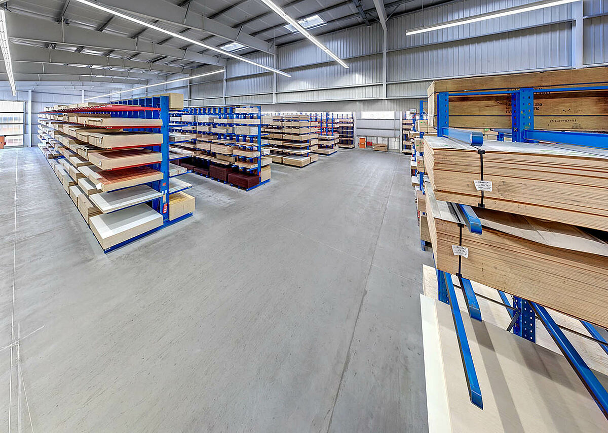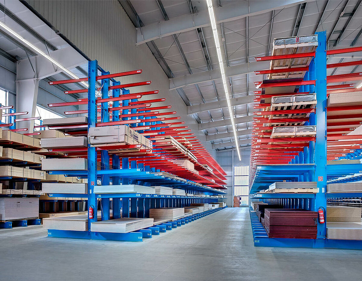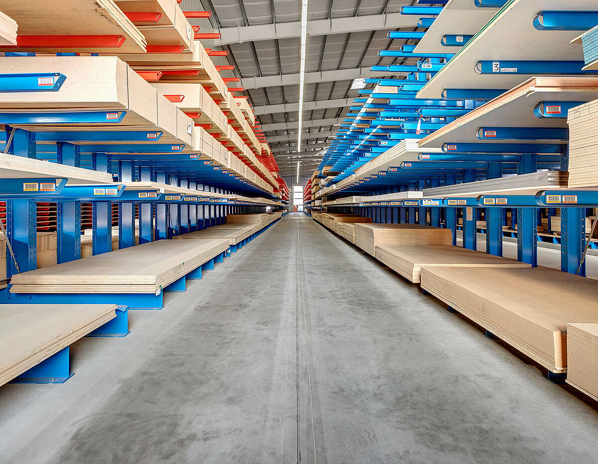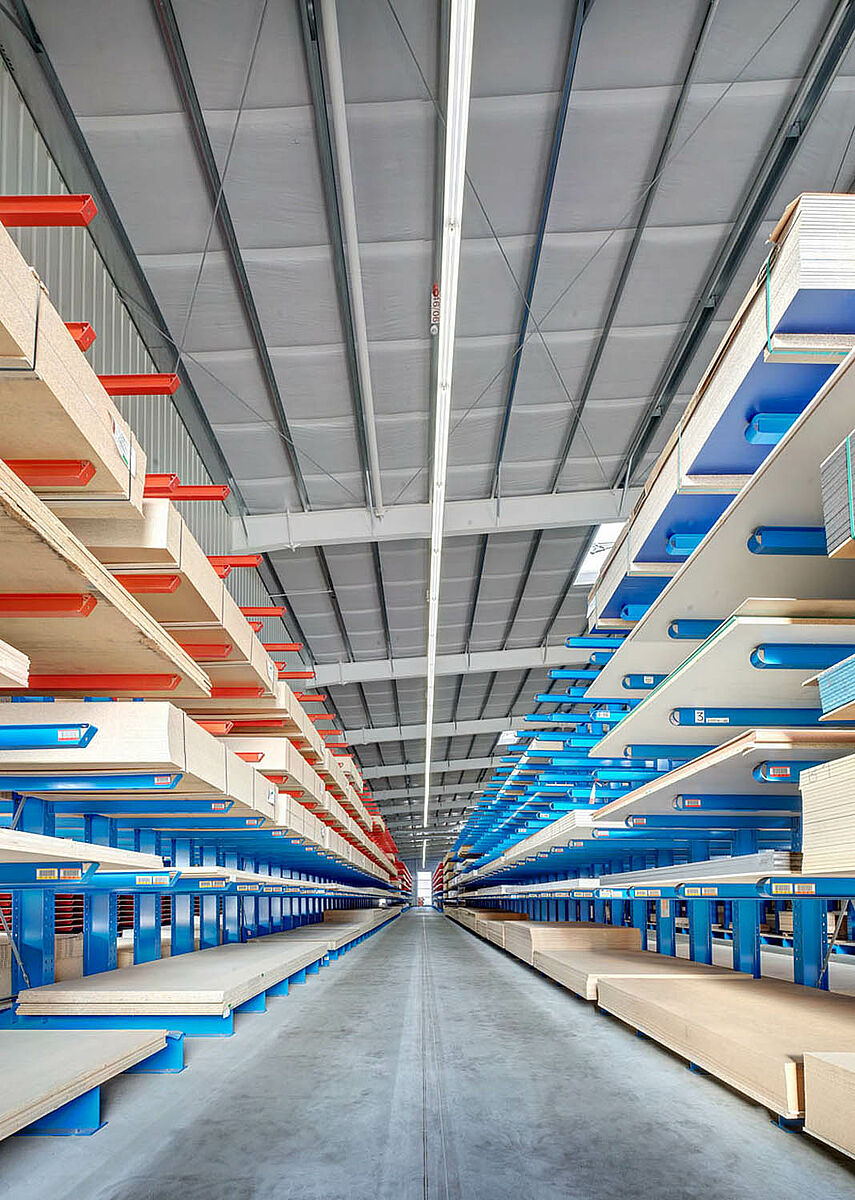 Nel capannone destinato alle tavole di legno, la lunghezza dei bracci, che ha uno sbraccio max di 2.100 mt, consente di immagazzinare senza problemi tavole pannelli di legno e di truciolato. Qui il magazzino ha un'altezza di 6.500 mm, mentre la movimentazione delle merci avviene tramite un carrello multidirezione, con piattaforma regolabile.