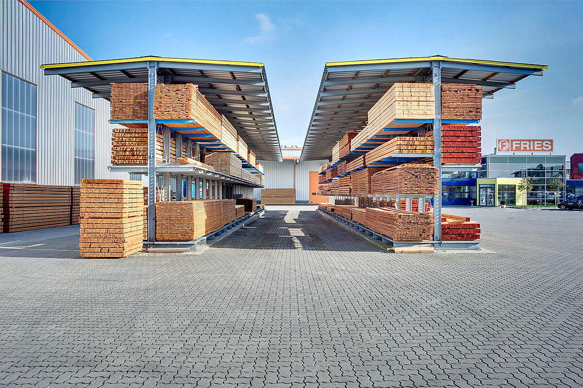 Per lo spazio disponibile OHRA ha fornito degli scaffali con bracci a sbalzo in acciaio zincato a caldo, con tettoia, in maniera tale che il legname fosse al riparo dalla pioggia e potesse al tempo stesso "respirare". Per lo spazio disponibile OHRA ha fornito degli scaffali con bracci a sbalzo in acciaio zincato a caldo, con tettoia, in maniera tale che il legname fosse al riparo dalla pioggia e potesse al tempo stesso "respirare".