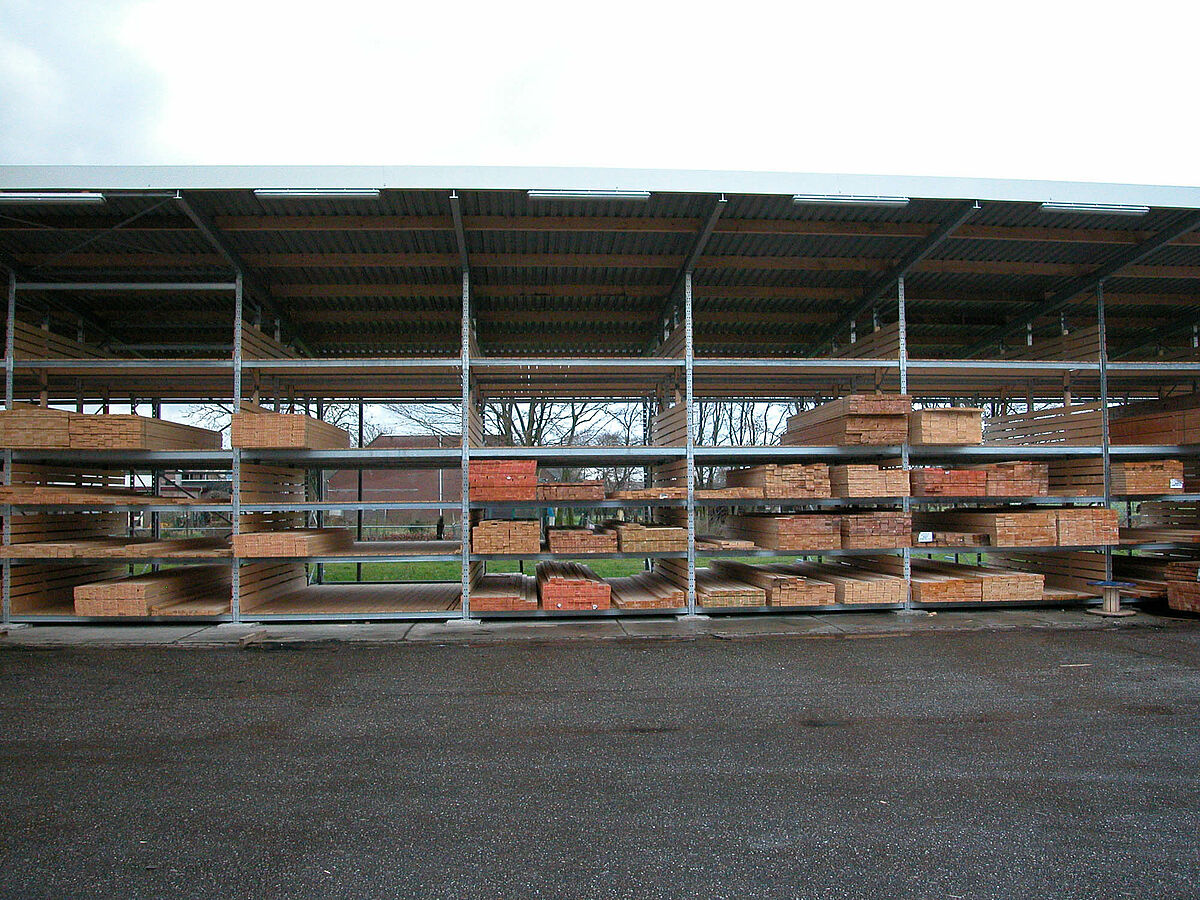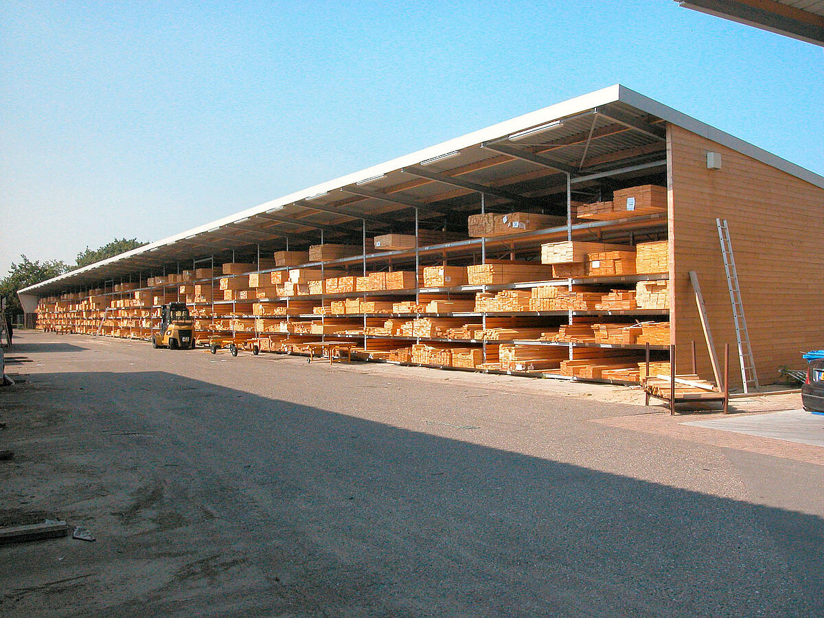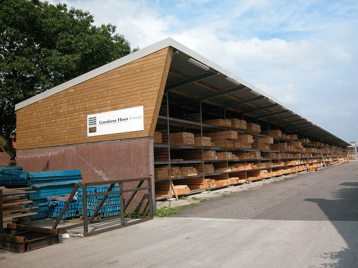 Il nuovo magazzino è stato realizzato da OHRA. L'impresa di Kerpen (Germania) si è specializzata nelle soluzioni a scaffalature per il commercio di materiali da costruzione e di legname. Alla Gooskens è stato adottato il sistema di scaffalature portapallet di OHRA. Per raggiungere la profondità di stoccaggio richiesta, gli esperti di OHRA hanno disposto, uno dietro all'altro, diversi telai di questo sistema corredandoli di fondi di legno. I telai sono realizzati in profilati di acciaio laminato a caldo che, in caso di collisione, cedono elasticamente mantenendo inalterata la propria elevata capacità di carico verticale. Una tettoia sulla struttura protegge il legno immagazzinato dalle intemperie e fa del magazzino a scaffalature un fabbricato a sé stante. Complessivamente il nuovo magazzino ha un'altezza di 6 metri e una lunghezza di 120 metri. I cinque livelli di stoccaggio hanno una capacità di carico di 2.800 chilogrammi ciascuno.