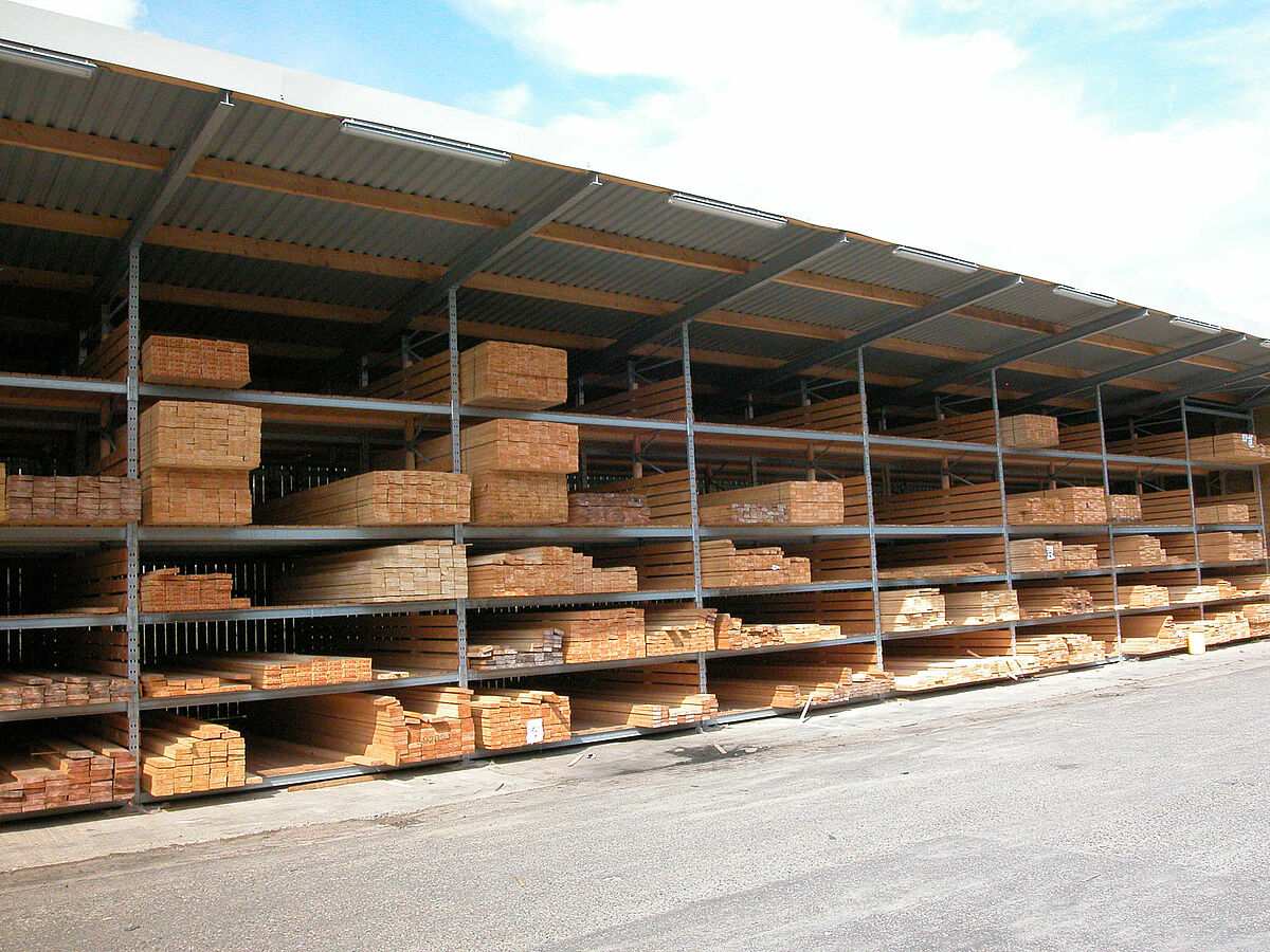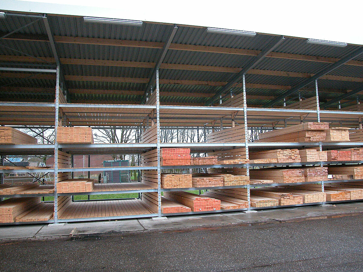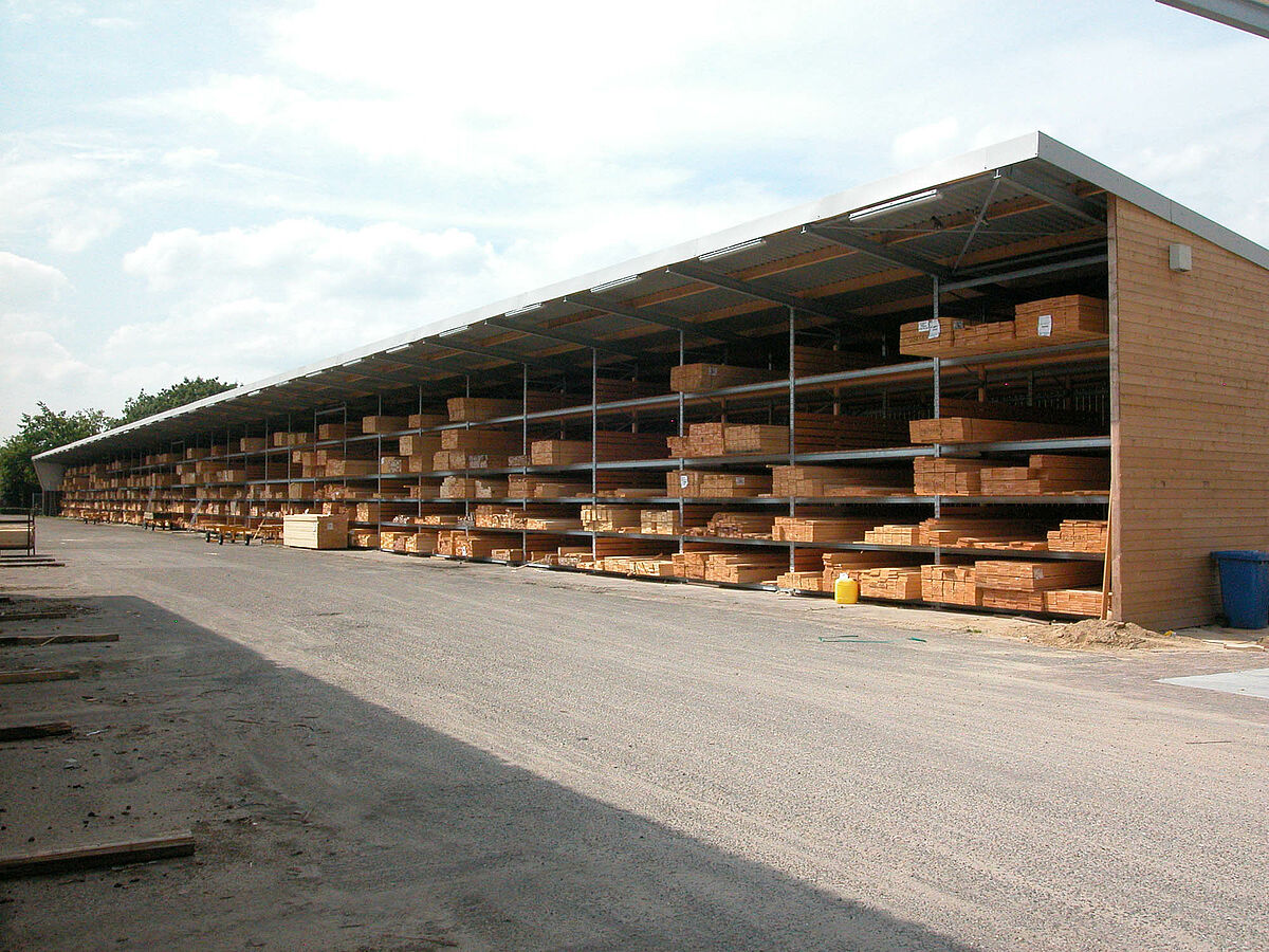 Il nuovo magazzino è stato realizzato da OHRA. L'impresa di Kerpen (Germania) si è specializzata nelle soluzioni a scaffalature per il commercio di materiali da costruzione e di legname. Alla Gooskens è stato adottato il sistema di scaffalature portapallet di OHRA. Per raggiungere la profondità di stoccaggio richiesta, gli esperti di OHRA hanno disposto, uno dietro all'altro, diversi telai di questo sistema corredandoli di fondi di legno. I telai sono realizzati in profilati di acciaio laminato a caldo che, in caso di collisione, cedono elasticamente mantenendo inalterata la propria elevata capacità di carico verticale. Una tettoia sulla struttura protegge il legno immagazzinato dalle intemperie e fa del magazzino a scaffalature un fabbricato a sé stante. Complessivamente il nuovo magazzino ha un'altezza di 6 metri e una lunghezza di 120 metri. I cinque livelli di stoccaggio hanno una capacità di carico di 2.800 chilogrammi ciascuno.