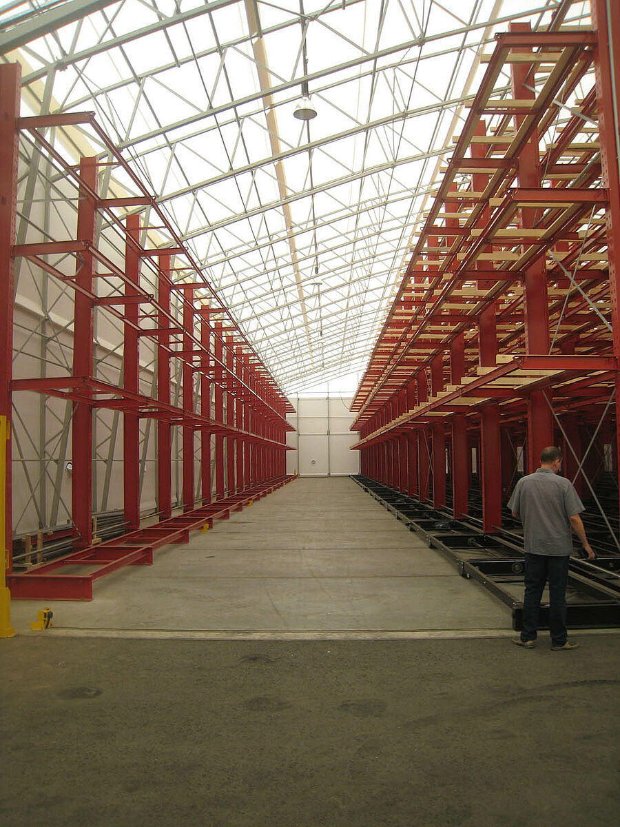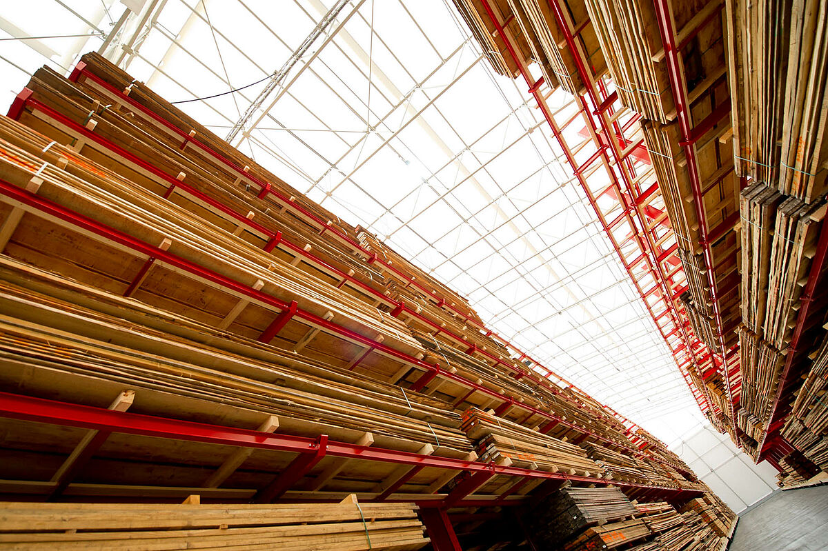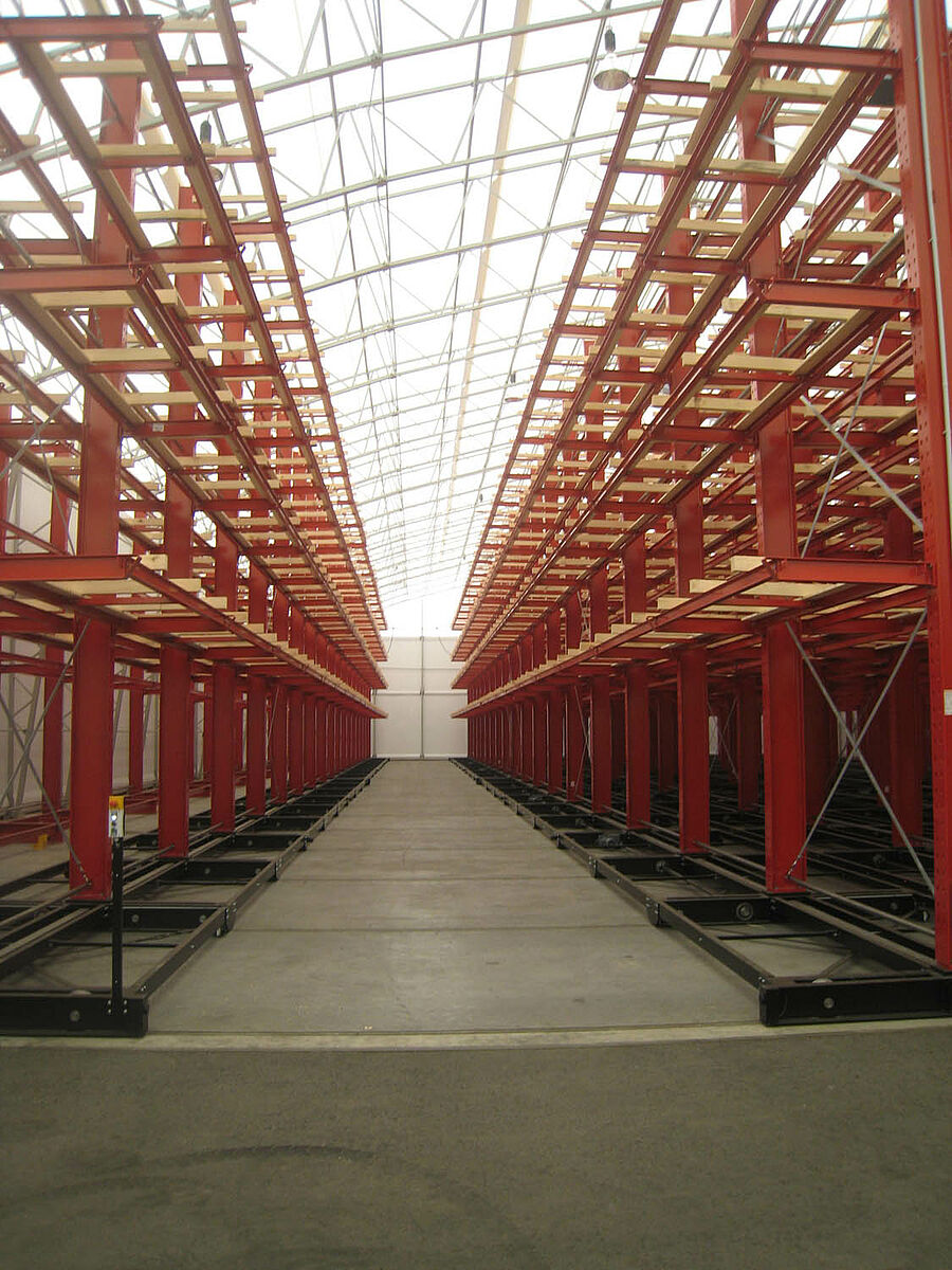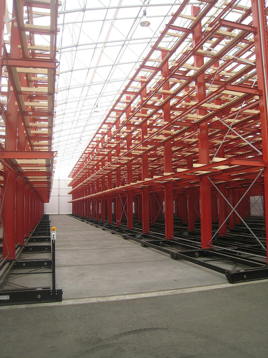 OHRA si è occupata dell'allestimento dell'intero impianto di scaffalature. Ciò ha compreso anche il montaggio dei binari necessari per il transito dei mezzi di trasporto, effettuato all'aperto prima della costruzione del capannone. Su un totale di dieci scaffalature cantilever di 4-5 livelli ciascuna, lunghe 60 metri e alte fino a 9,2 metri, due sono state fissate a pavimento. Le restanti otto sono state montate da OHRA su 58 carrelli mobili lunghi 58 metri. I carrelli mobili sono azionati elettricamente e vengono spostati tramite un telecomando dal muletto. Solo la corsia interessata si apre - e così la capacità di stoccaggio sulla superficie disponibile praticamente raddoppia.