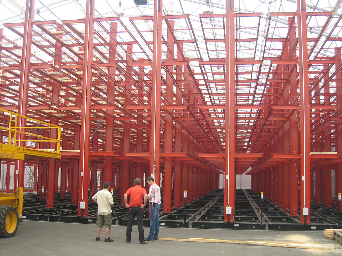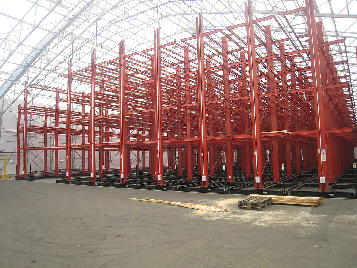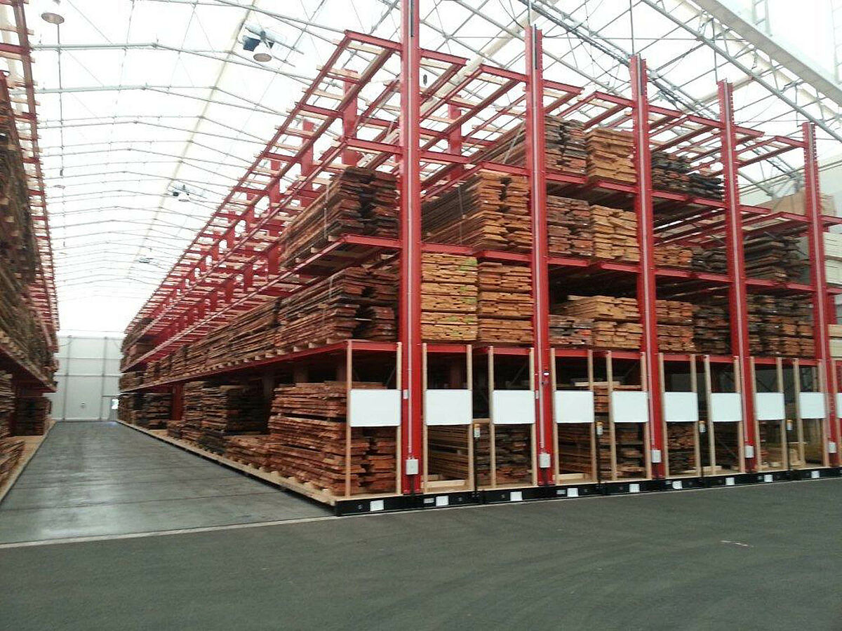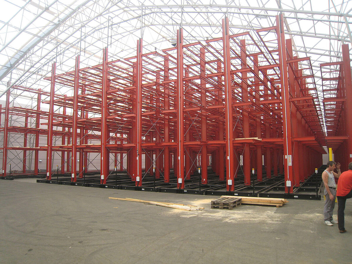 OHRA si è occupata dell'allestimento dell'intero impianto di scaffalature. Ciò ha compreso anche il montaggio dei binari necessari per il transito dei mezzi di trasporto, effettuato all'aperto prima della costruzione del capannone. Su un totale di dieci scaffalature cantilever di 4-5 livelli ciascuna, lunghe 60 metri e alte fino a 9,2 metri, due sono state fissate a pavimento. Le restanti otto sono state montate da OHRA su 58 carrelli mobili lunghi 58 metri. I carrelli mobili sono azionati elettricamente e vengono spostati tramite un telecomando dal muletto. Solo la corsia interessata si apre - e così la capacità di stoccaggio sulla superficie disponibile praticamente raddoppia.