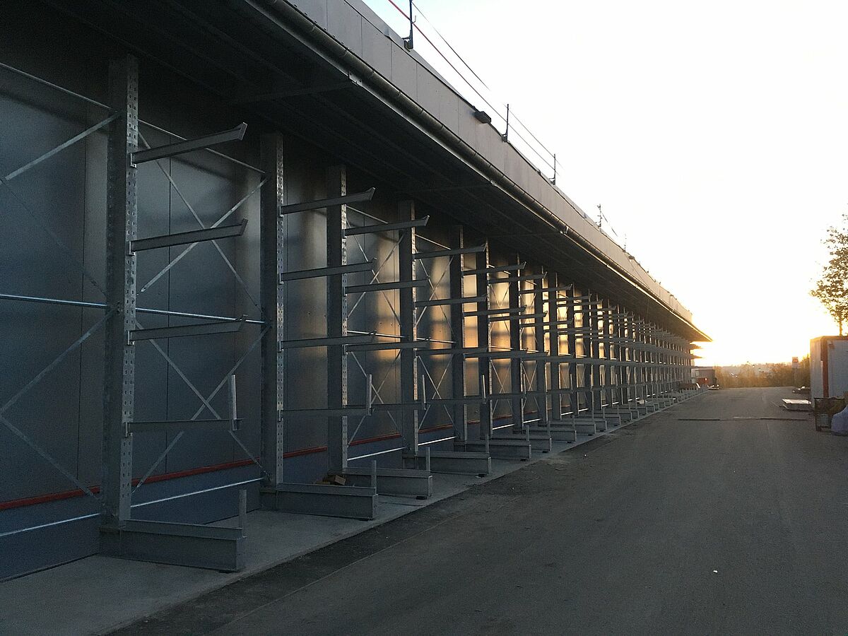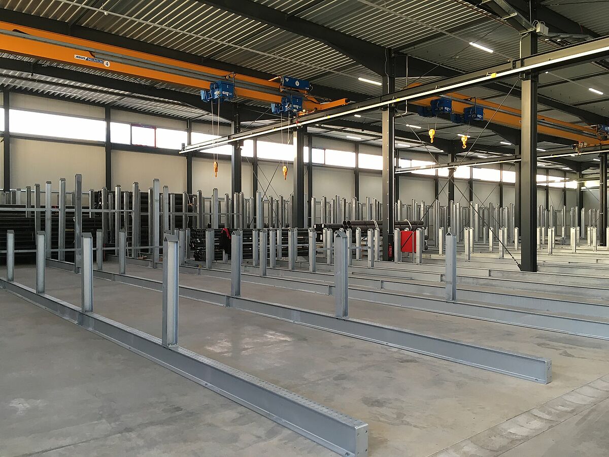 I tubolari lunghi e pesanti invece e i fasci sono stoccati nelle scaffalature a montanti, i profili leggeri sono collocati nei cantilever OHRA. Le scaffalature zincate alte circa 5 metri sono installate lungo le pareti interne del deposito e poi intorno al perimetro esterno. Mensole di lunghezza 1,4 metri con capacità fino a 640 kg garantiscono il sicuro posizionamento dei profili.