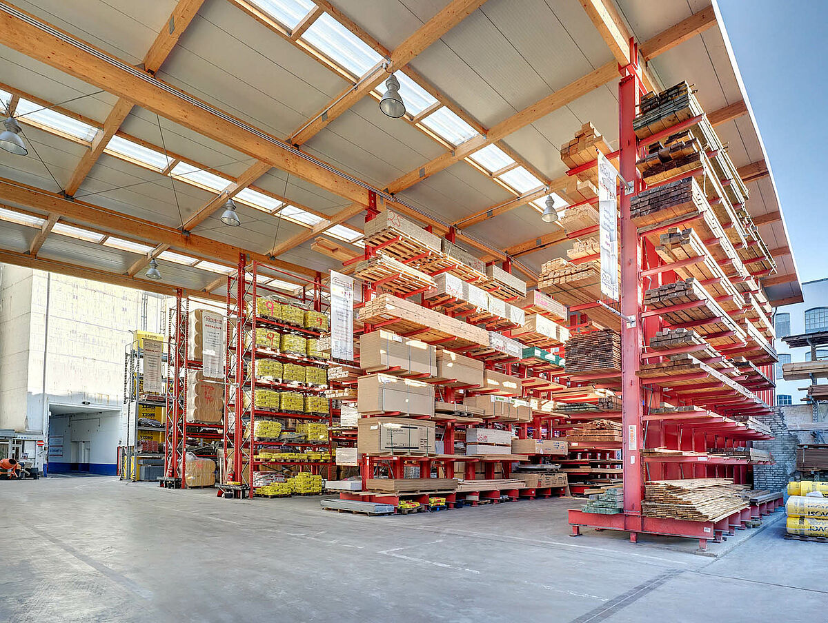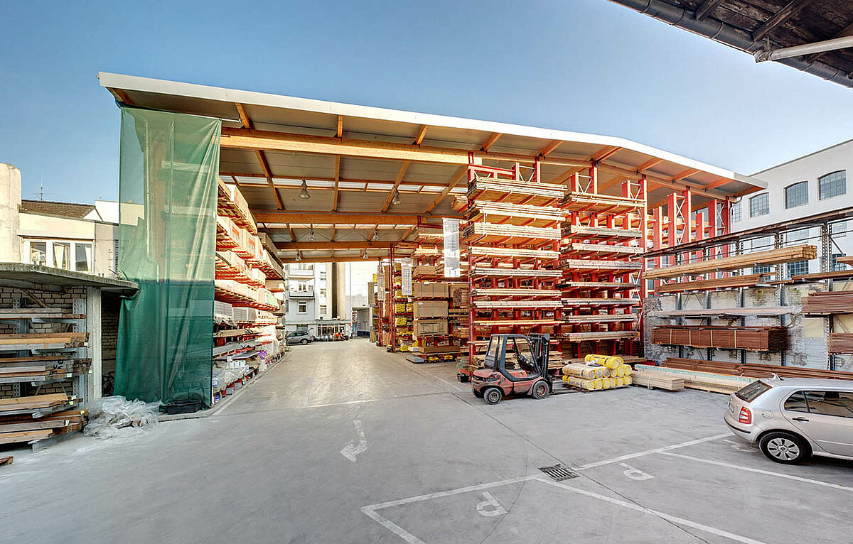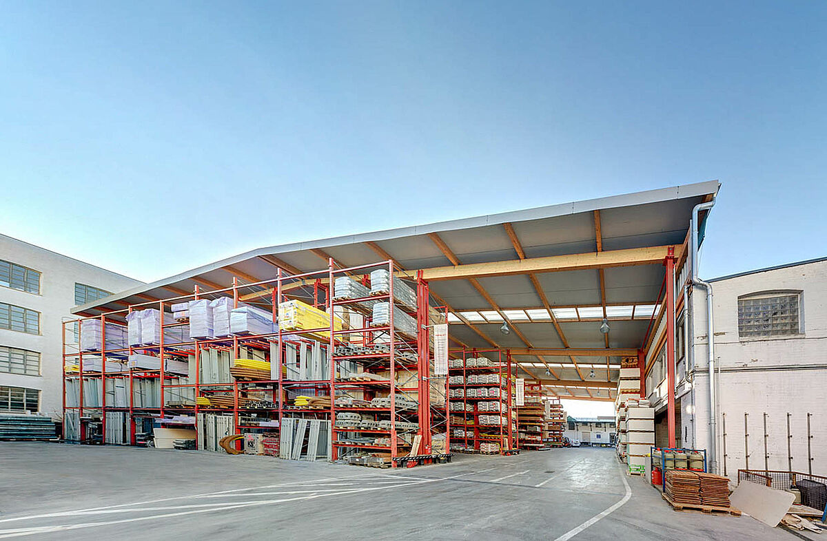 Il nuovo capannone a scaffali è una specialità di OHRA. I supporti e il telaio delle scaffalature con bracci a sbalzo e degli scaffali per pallet fungono, oltre che da magazzino, anche da sottostruttura portante per tetto e parete. I due scaffali per pallet portanti per il tetto e gli scaffali con bracci a sbalzo con un'altezza di 9.500 mm supportano l'intera struttura. Inoltre è stata realizzata un'area di carico coperta, con 10 mt di sporto. Il tetto, realizzato con assi in legno, è stato realizzato dall'azienda stessa.