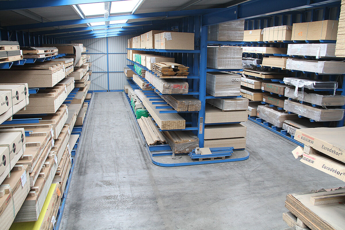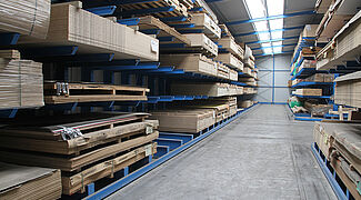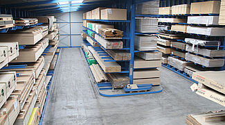 È stato quindi creato un padiglione di 38 metri di lunghezza, le cui pareti esterne sono composte rispettivamente da scaffalature cantilever unilaterali. Inoltre è stata disposta un’altra scaffalatura cantilever al centro delle due scaffalature laterali. I binari di guida consentono l’uso di un carrello elevatore laterale a più vie anche in presenza di corsie strette. Grazie agli scaffali personalizzati con altezze di 5,5 metri, 6,3 metri e 7,1 metri è stato possibile adattare il padiglione in modo ottimale all’ambiente. Ogni parte dei cantilever, lunghi 1850 millimetri, sopporta un carico che arriva fino a 600 chili. I cantilever non sono avvitati o saldati, ma vengono agganciati in modo flessibile alle colonne degli scaffali tramite una griglia di 100 millimetri. In questo modo possono cedere agli urti.