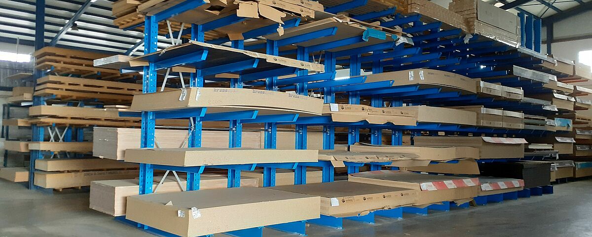 Con il nuovo sistema di scaffalature, OHRA è riuscita ad ottenere un elevato utilizzo degli spazi, ma soprattutto ha adattato la fila di scaffalature appositamente al numero e alle dimensioni delle confezioni di legname stoccate presso Maderas Fanega: Oltre ai pannelli da 2.440 x 1.220 mm, l'azienda conserva anche grandi pacchi da 2.850 x 2.100 mm. Dotare tutte le scaffalature di bracci cantilever di lunghezza corrispondente avrebbe utilizzato troppo spazio, soprattutto perché la gamma di articoli è limitata in queste dimensioni. Così OHRA equipaggiò solo un lato della fila di scaffali con bracci cantilever lunghi 1.850 millimetri e l'altro lato con bracci cantilever lunghi solo 1.200 millimetri. Al fine di garantire la stabilità della scaffalatura, nonostante questa asimmetria, i supporti sono stati sovradimensionati di conseguenza.