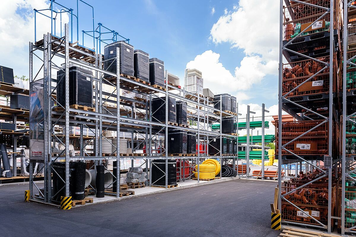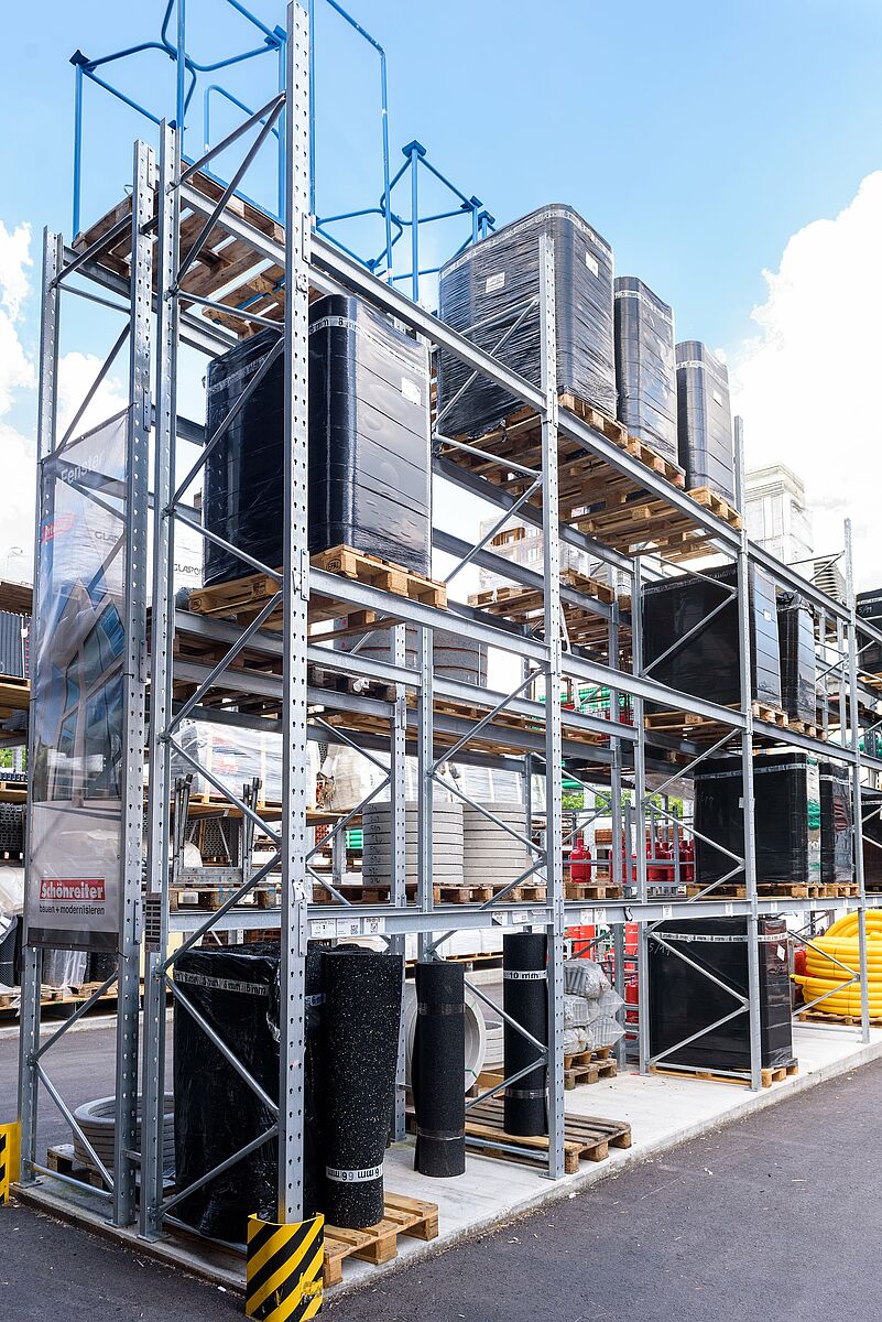 L'azienda ha optato per una combinazione di scaffalature Cantilever e scaffali portapallet: In questo modo è possibile conservare in modo flessibile una grande varietà di articoli. Gli scaffali sono stati perfettamente adattati alle esigenze dell’assortimento. Nelle scaffalature cantilever alte 7.510 mm, possono essere impilate tre pallet di materiale isolante uno sopra l'altro, su cinque livelli di stoccaggio. Grazie alla capacità di carico statica di 4.500 Kg, le merci pesanti possono essere agevolmente immagazzinate su Europallet negli scaffali.