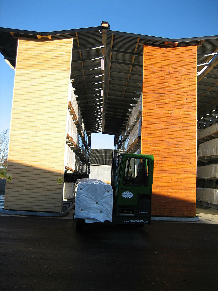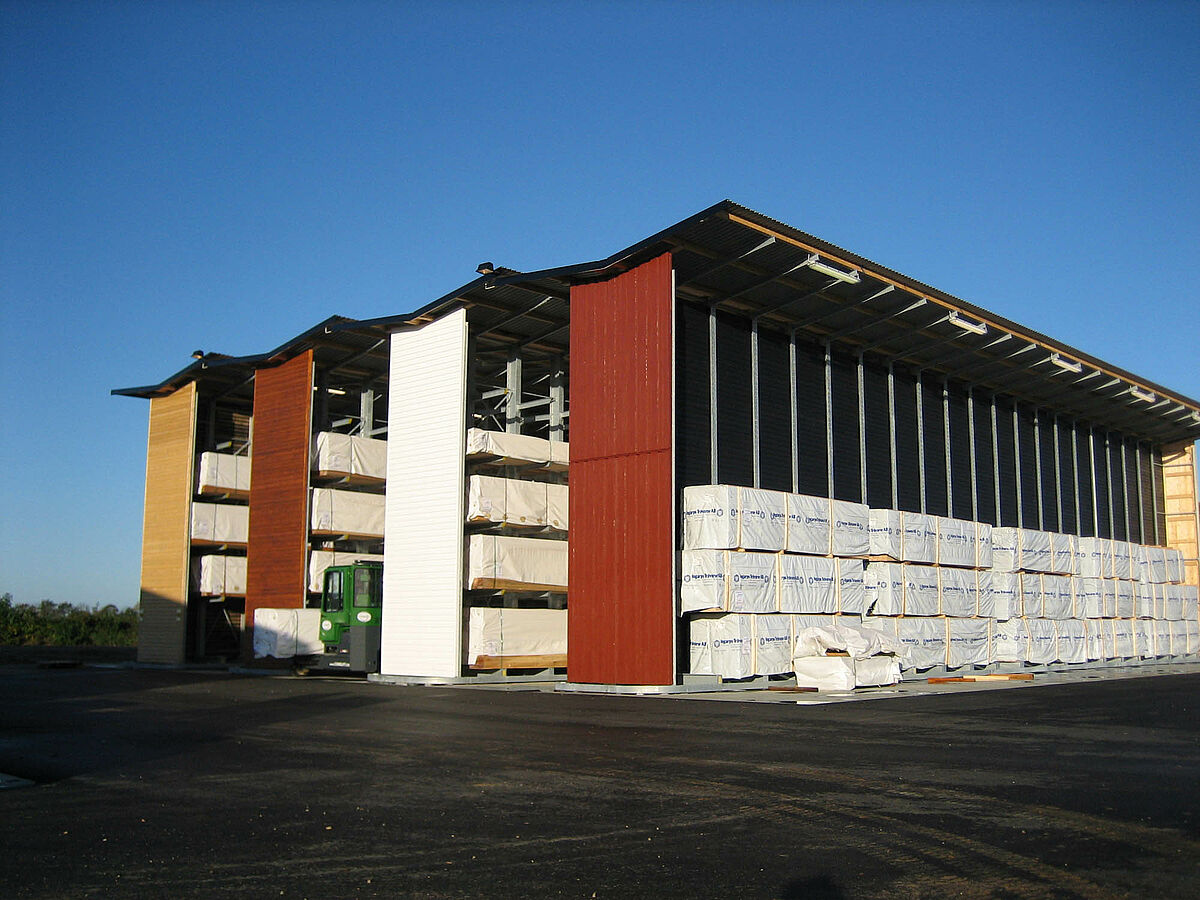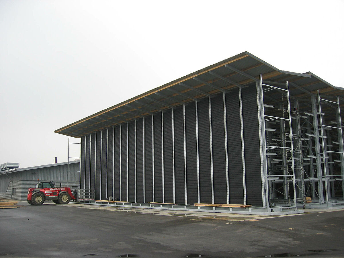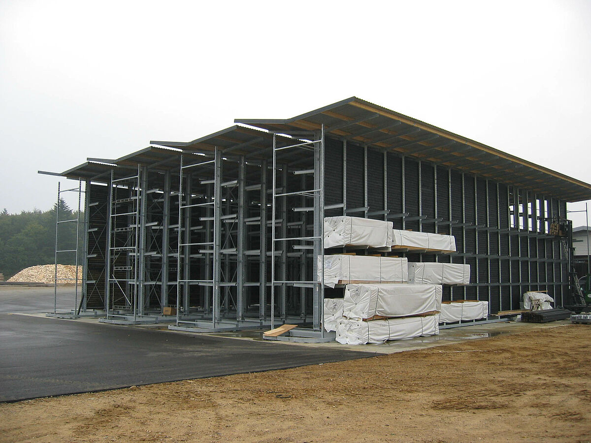 Il legno accatastato non trattato in passato era disposto in cortile a cielo aperto. A tale scopo si utilizzata un’ampia superficie e la gestione dei profili in legno richiedeva molto tempo. Il cliente quindi desiderava ottenere una possibilità di stoccaggio da creare nelle dirette vicinanze del centro di lavorazione del legno nello stabilimento di produzione presente. Al contempo il nuovo magazzino doveva essere realizzato occupando il minor spazio possibile per contenere i costi relativi alla pavimentazione in cemento e della copertura. Doveva essere prevista inoltre la possibilità di ampliamento per il futuro senza dove intervenire radicalmente sulla struttura.