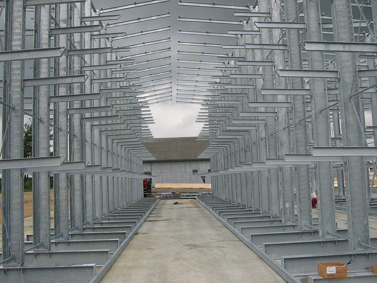I corridoi sono stati dotati di guide di conduzione in base ai requisiti dell’impilatore laterale. Gli ingressi sui due lati dei corridoi sono stati protetti contro il vento e l’acqua utilizzando telai rivestiti. Gli elementi del tetto sovrapposti proteggono dagli influssi meteorologici diretti e consentono contemporaneamente un’adeguata ventilazione. Gli scaffali più esterni sono stati rivestiti con una palancolata che serve analogamente come protezione dalle intemperie.
