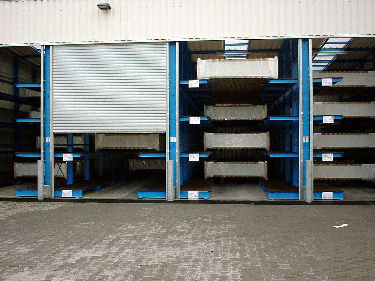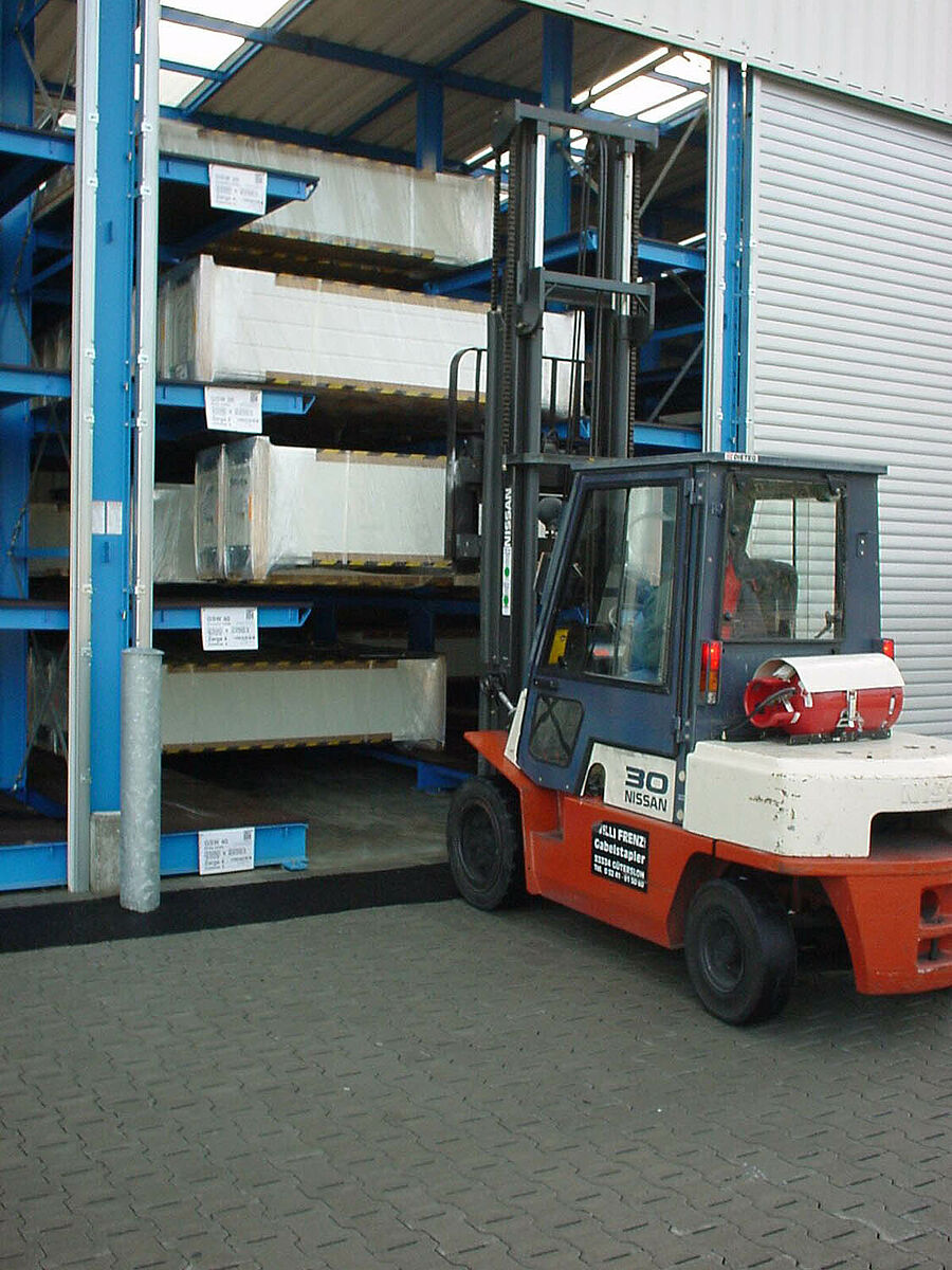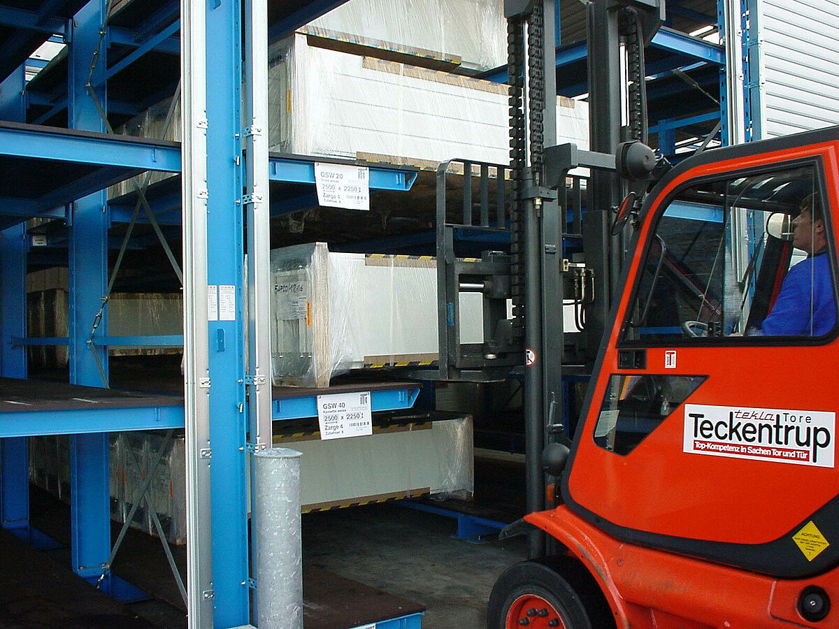 Con questo sistema i comparti del cantilever servono praticamente da superfici di scarico. Secondo il tipo, le porte vengono smistate nei rispettivi comparti e quindi immagazzinate con grande risparmio di spazio. Con poche manovre il carrello elevatore può svuotare il carico di un intero comparto e caricarlo sul camion.