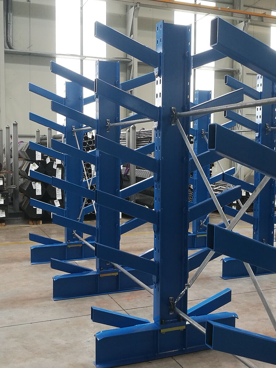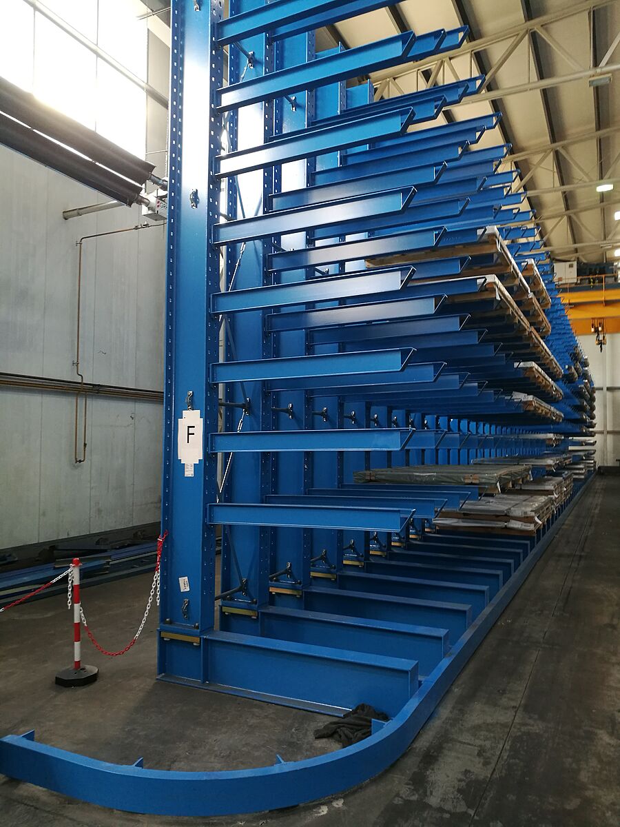 OHRA ha anche installato sette linee dei suoi rack per bracci inclinati in una seconda area di stoccaggio. Qui, tubi, profili e barre sono stoccati con la gru. In questo tipo di rack, i cantilever sono realizzati con un passo di 20°. Il pacco merci lungo scivola nel vano designato, lo stoccaggio con la gru è notevolmente semplificato. I bracci sono montati anche con scaffali inclinati. I rack montati alla thyssenkrupp Materials sono alti 2,5 metri e possono ospitare fino a 6.000 mm di merce su sette livelli. La capacità di carico dei bracci lunghi 500 mm è di 800 kg.