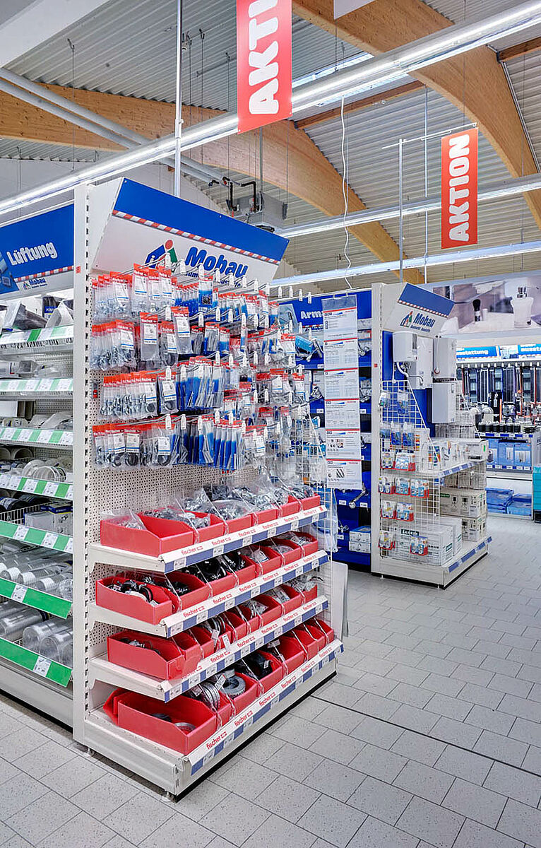 A seconda del tipo di negozio, OHRA offre un sistema di stoccaggio professionale e orientato al cliente, per diverse applicazioni e materiali. Scaffalature verticali per listelli e materiali lunghi, scaffali porta pallet per bancali e soppalchi per l’area vendita.