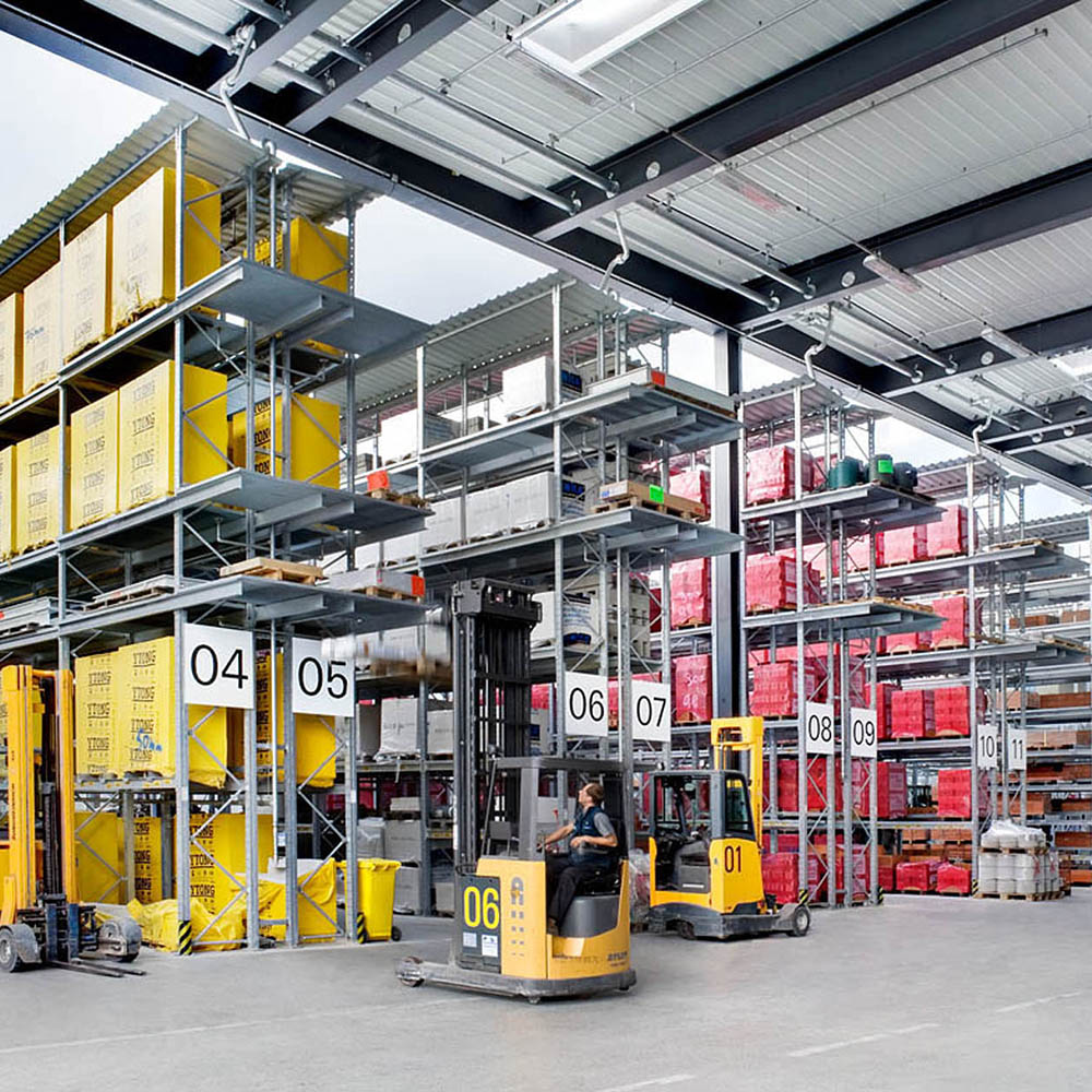 I porta pallet sono sistemi di stoccaggio di gran lunga più utilizzati per moltissimi requisiti. Oltre al classico stoccaggio di merci su diversi pallet (ad es euro pallet o pallet industriali), questi scaffali possono essere alloggiati anche con ausili di carico come contenitori a griglia o utensili pesanti. Le scaffalature porta-pallet sono utilizzate in molti settori, come ad esempio nel commercio di materiali edili, nelle spedizioni, nell'industria nella logistica o per stoccaggio di carichi pesanti.