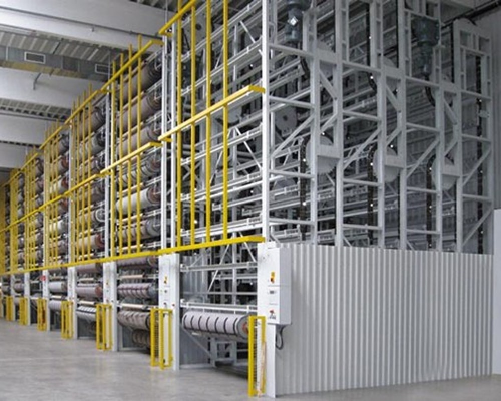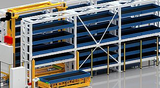 3. Il TowerMat TM-RE è la versione più potente e progettata per grandi quantità di stoccaggio, con un trasloelevatore che si sposta lateralmente lungo più torri di stoccaggio.