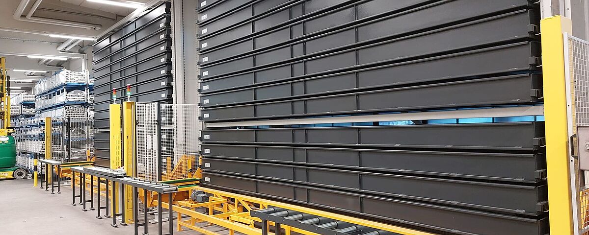 Il TowerMat è ideale per lo stoccaggio salvaspazio di materiali lunghi, lamiere o pallet, soprattutto dove è necessario sfruttare in modo efficiente l’altezza del capannone. Il sistema di stoccaggio verticale è modulare e si adatta in modo flessibile sia alle merci da stoccare che alle condizioni strutturali. A seconda della versione, possono essere alloggiati cassette o pallet di sistema con un peso fino a 8 tonnellate. La fornitura automatica della merce avviene secondo il principio “merce all’uomo”.